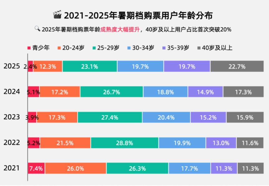 另一项重要数据是购票年龄分布的变化:灯塔数据显示2025年暑期购票年龄成熟度大幅提升,20-24岁占比已经从2021年的26%下降到了12.3%,而35岁以上占比则相较2021年已经翻倍,占比超过4成。