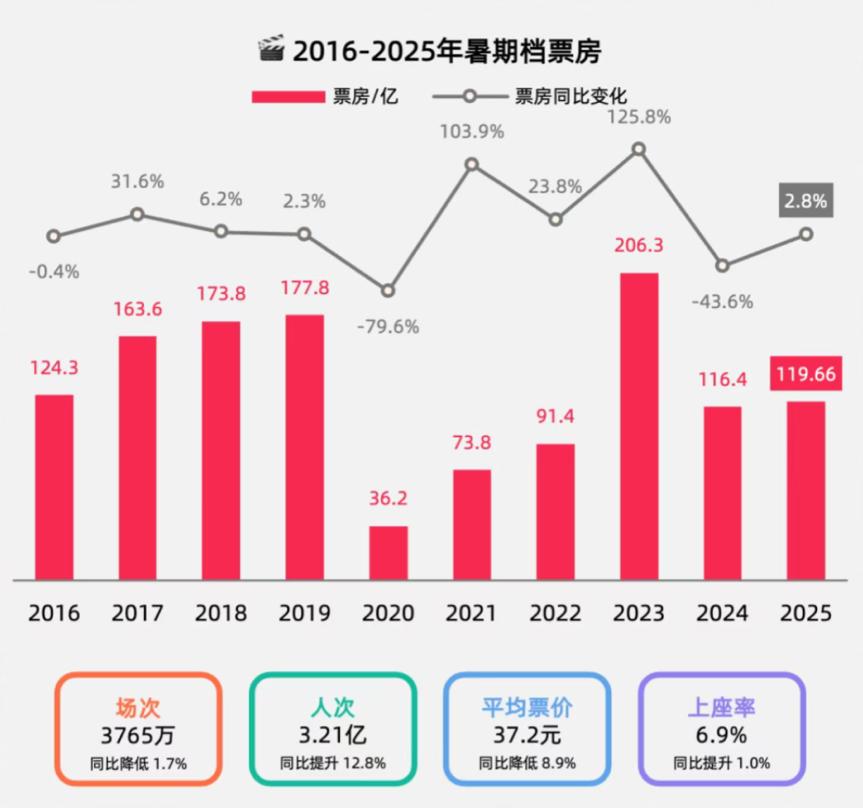 而刚刚过去的暑期档,虽然总票房只比2024年多了3亿,但实际上的行业趋势却有更多细节上的好转。灯塔研究院发布的《2025年暑期档电影市场洞察报告》显示,2025年暑期档票房同比去年增长仅2.8%,但观影人次同比增长达到12.8%,上座率同比上升1%,票价同比下降了8.9%。