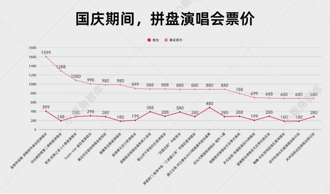 拼盘演唱会则整体偏向亲民定价,其中 “嗨爆・乐在现场超级巨星演唱会” 与“声声回响巡回演唱会宿迁站”的内场最高票价为 680 元,是十一期间所有演唱会类型中的最低票价,凸显出拼盘演出高性价比的特点。