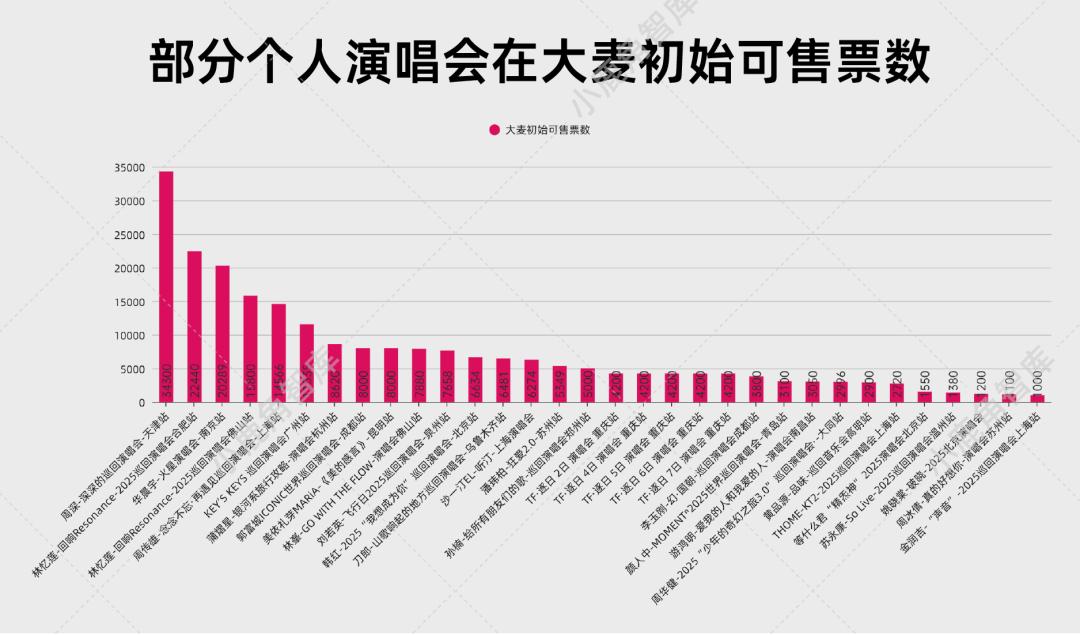 大麦初始可售票量的数量区间差异显著。体育场因场地容量大,初始可售票数量往往极为可观,像周深“深深的”巡回演唱会天津站在天津奥林匹克中心体育场举办,大麦初始可售票达34300张 ,能让更多粉丝有购票机会,也反映出巨星演唱会强大的市场消费吸纳力;华晨宇火星演唱会南京站在南京汤山音乐谷举办,在大麦的初始可售票 20289 张,汤山音乐谷能承载一定规模人群,加上华晨宇拥有众多狂热粉丝,大量初始售票既能体现其市场热度,又能充分利用场地资源。