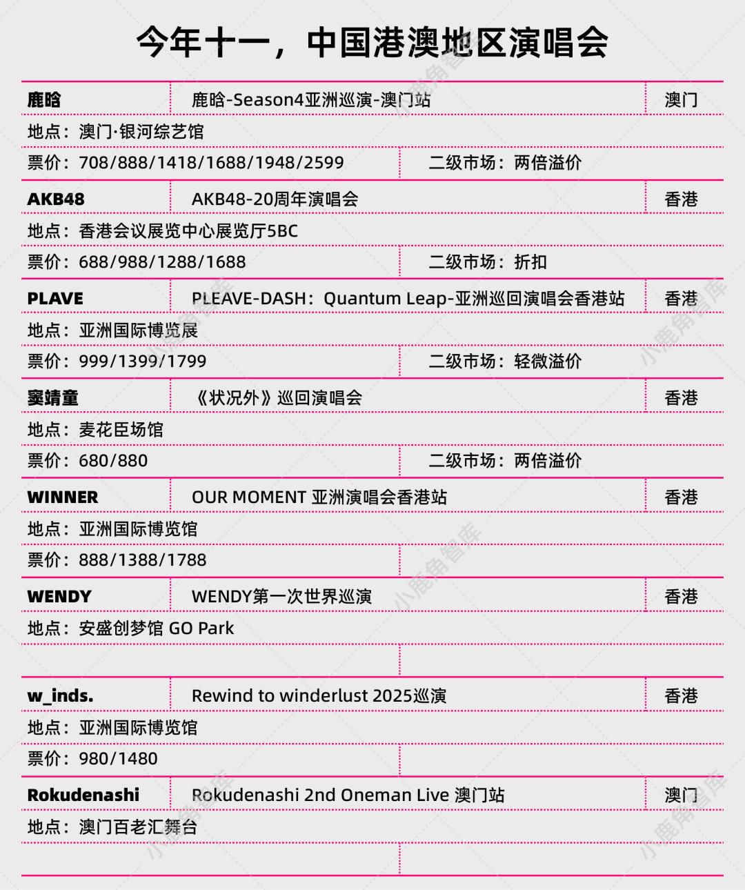 其中,内地歌手鹿晗和窦靖童共举办2场,日韩歌手以及组合总计会有 5 场在港澳上演,占据了最大比例。值得注意的是,韩国虚拟男子团体PLAVE在宣布其亚洲巡演后,将在十一假期香港亚洲国际博览展举办其演唱会。