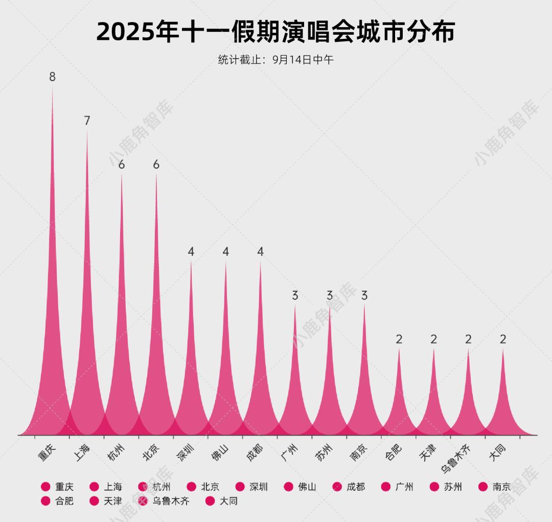 从演唱会区域布局来看,2025 年十一假期期间,一共落地内地41座城市,计划举办的 84 场演唱会中,主要落地在南方市场,占比超七成,区域差异较为明显。