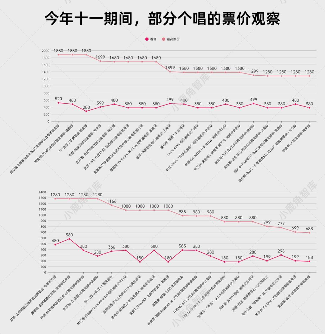 2025 年十一假期演唱会票价呈现明显分层,不同艺人及演出类型的定价差异显著。