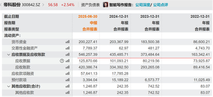 但是,帝科股份面临的资金压力却是摆在眼前的现实难题。一方面,近三年帝科股份营收持续增长的同时,应收票据及应收账款规模上升了6倍多,至2025年6月末已达54.63亿元,占到同期总资产的59%。随着光伏行业寒冬期加深,公司的坏账在增加,仅2024年就产生坏账准备金1.28亿元。