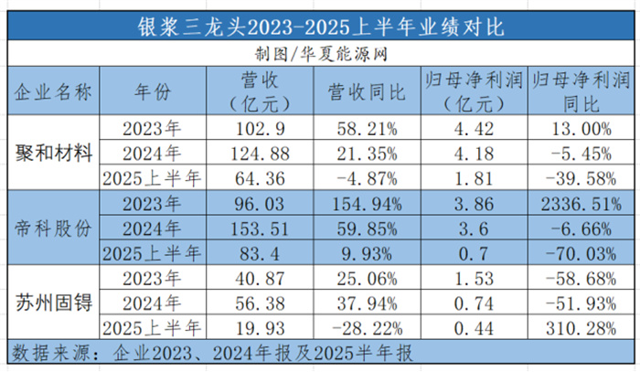 华夏能源网注意到,不止帝科股份一家,与其并称银浆三龙头的聚合材料、苏州固锝在2024年也出现了增收不增利的现象,今年上半年,更是整体呈现营收、利润双下降。综合来看,帝科股份面临的业绩问题,更多是受到外部环境的影响所致: