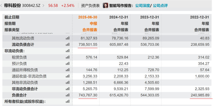另一方面,帝科股份的债务压力在显著上升。2020年到2024年,帝科股份的债务额分别为7.84亿、13.33亿、24.10亿、54.43亿、61.54亿元,5年间增长了6.8倍。今年上半年,负债额进一步上升到74.38亿元,负债率高达80.42%。