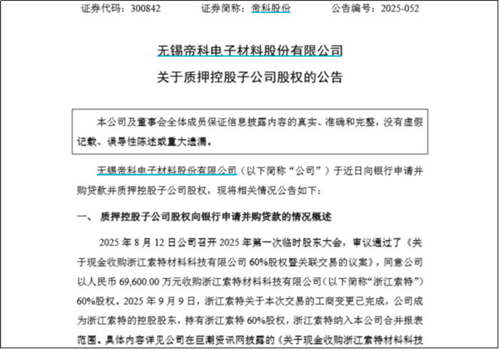 2025年5月,帝科股份重启收购浙江索特。相对于第一次收购,本次收购进展非常顺利,9月9日,帝科股份发布公告称,浙江索特已完成相关工商变更登记手续。