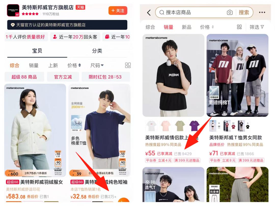 以冲锋衣为例,始祖鸟旗舰店的冲锋衣定价在 5000 元左右,而美特斯邦威冲锋衣价格仅需 200 元。然而,从其天猫和抖音官方店铺的数据来看,目前销量最高的仍是定价 30-50 元之间的男士T恤,这种反差实在难言转型成功。