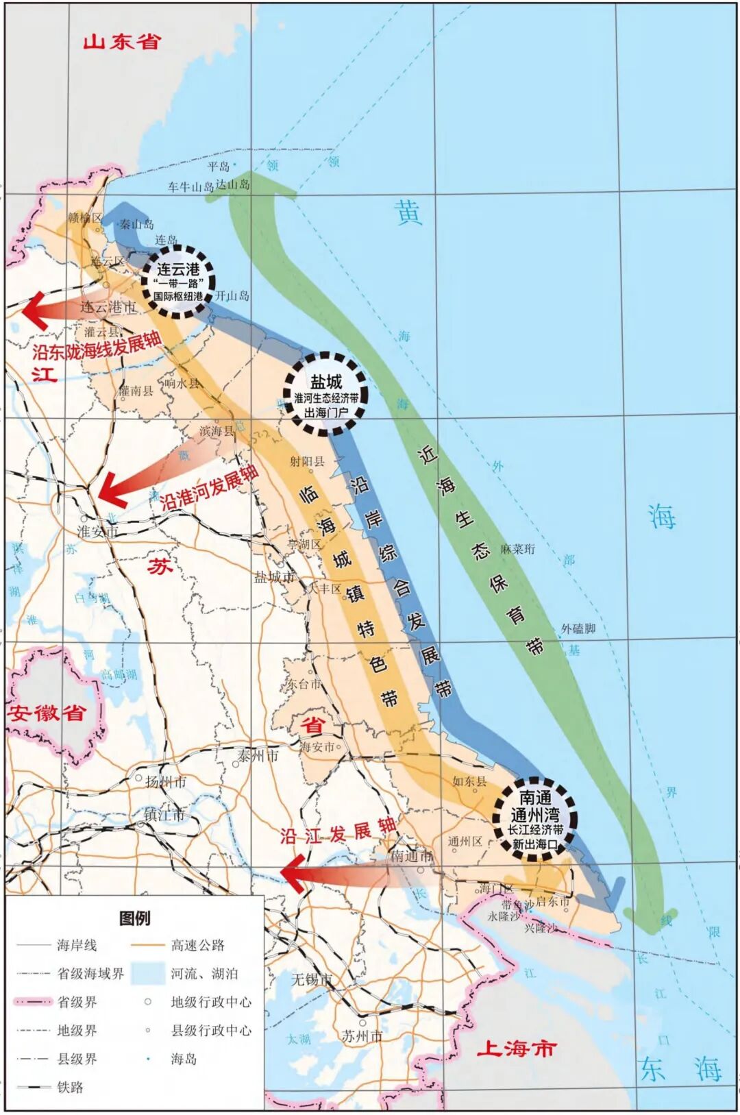 其中,“三门户”即连云港共建“一带一路”国际枢纽港、盐城淮河生态经济带出海门户、南通通州湾长江集装箱运输新出海口。