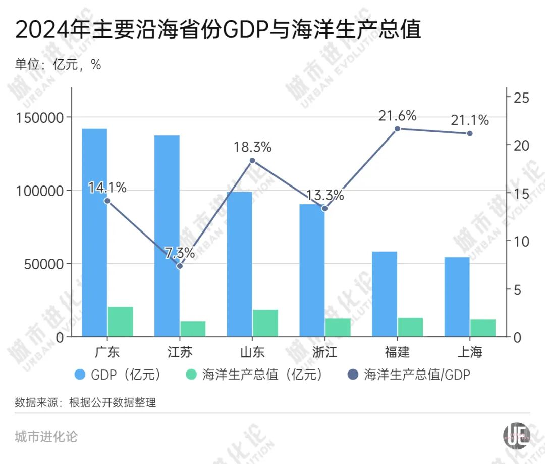 这一点,在对比广东时最为明显。2024年广东GDP为14.16万亿元,江苏GDP为13.70万亿元,两地间差值不足5000亿元。但同期广东的海洋生产总值是江苏的两倍左右。
