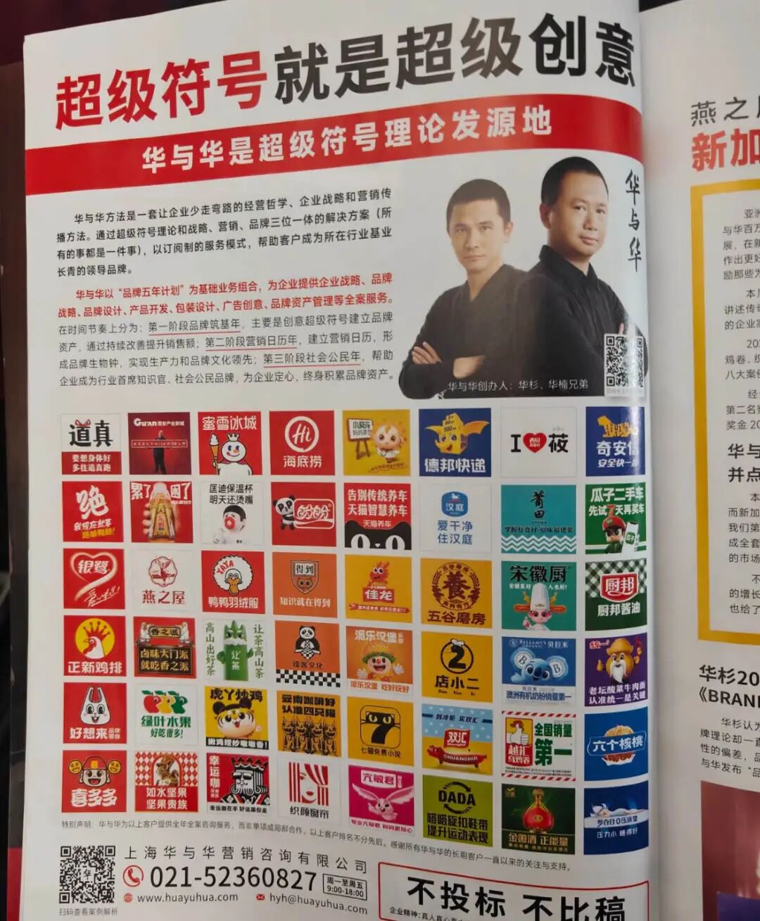 倘若你走近了仔细看,就会发现二华兄弟下面闪耀着两行大字:一则是华与华的经典slogan“超级符号就是超级理念”,另一个是华与华做广告的理念“不投标 不比稿”。