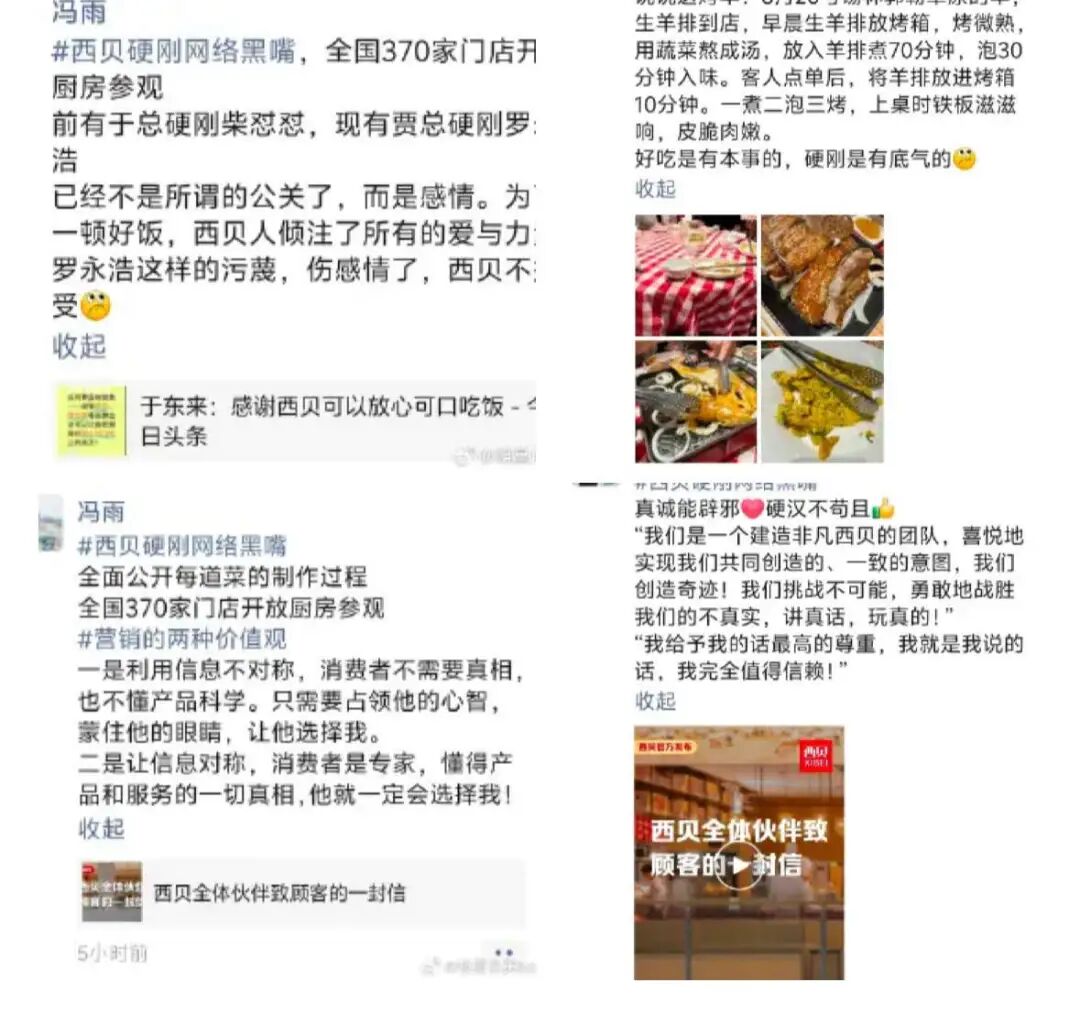 发了3次“#西贝硬刚网络黑嘴”、提到一次“今天吃了网络黑嘴的同款套餐”,并解释了西贝为何开放全国370家门店的厨房,以前不开放是为了“利用信息不对称,占领消费者心智,蒙住眼睛让他选择我;现在则是让信息对称,使消费者成为专家,那么他就一定会选择我。”