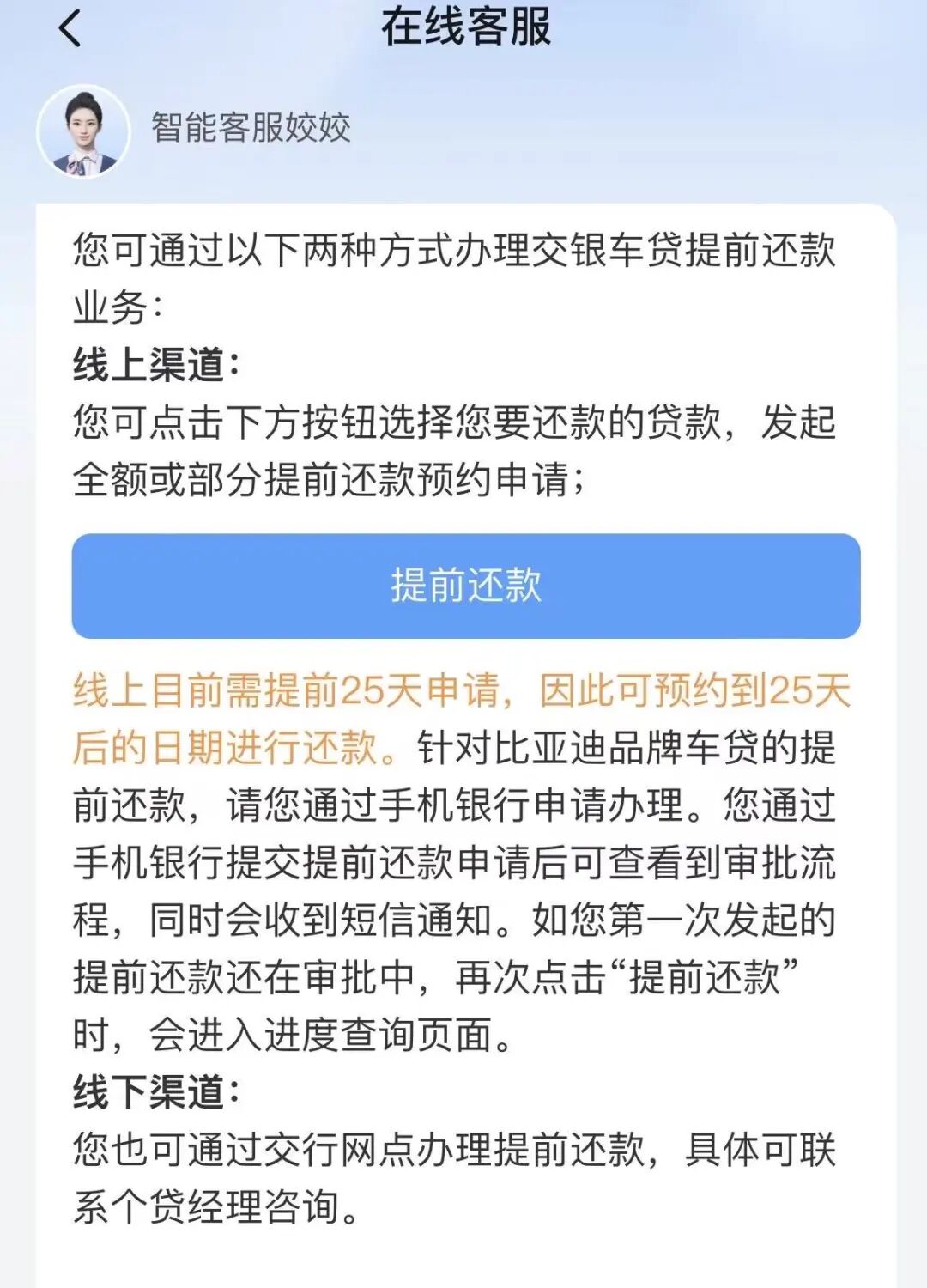 交通银行手机App智能客服显示,可以通过线上、线下两种渠道办理交银车贷提前还款业务,线上目前需提前25天申请,因此可预约到25天后的日期进行还款。借款人也可以通过交行网点办理提前还款。