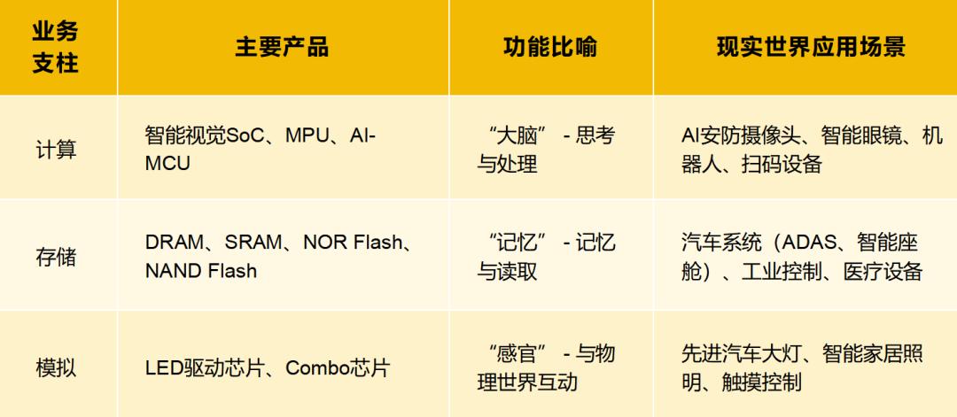 京君正的核心战略构建在“计算+存储+模拟”芯片的全方位产品组合,这三者协同工作,构成了几乎所有现代智能设备的基石。