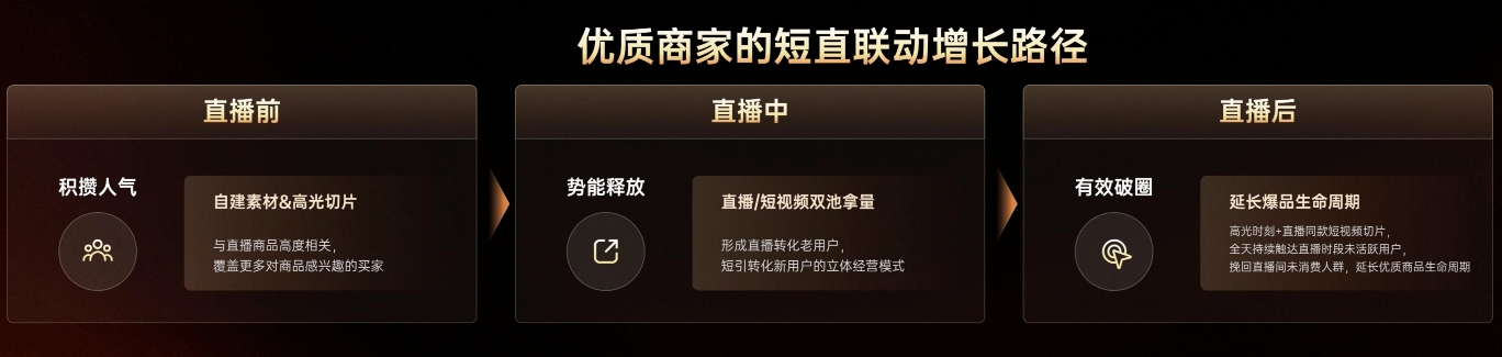 这套短直联动经营方式释放了商家的增长潜力。孔慧介绍:在直播前,通过发布与直播商品高度相关的短视频,覆盖目标用户,积攒人气;在直播中,通过制作直播切片、高光时刻发布释放短视频势能,实现直播和短视频双池拿量,精准吸引用户从短视频进入直播间观看,从而形成短视频转化新用户、直播转化老用户的经营效果;在下播后,还能利用工具发布直播同款短视频切片,延长直播间优质商品爆品在平台的分发周期,持续拉动成交。