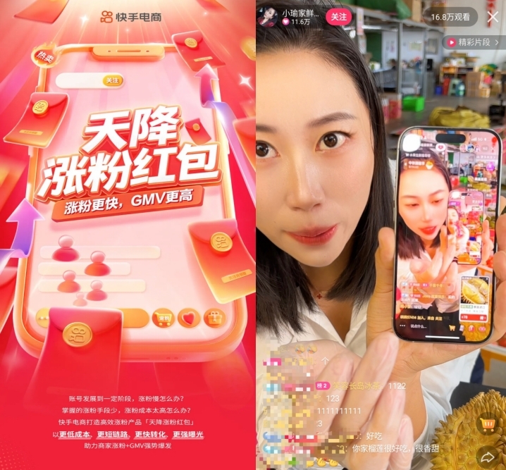 此前,快手电商上线了“天降涨粉红包”,商家可以借此工具向非关注用户发放红包,在吸引新用户关注的同时,引导用户产生购买兴趣,完成下单转化,进而实现引流—转粉—转客链路,帮助商家完成新粉关注和新客成交。