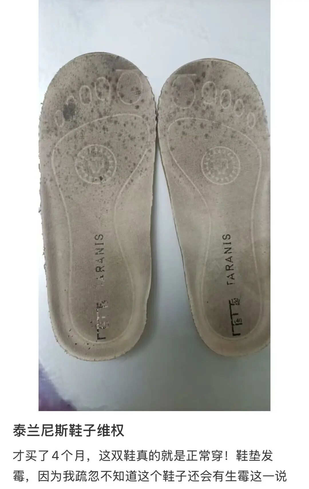 不少消费者都在网上反映泰兰尼斯容易发霉,而泰兰尼斯有一位高管回应道:鞋子内使用了活性炭除菌抑臭,但如果没有及时对鞋子进行晾晒或通风,很可能造成碳颗粒扩散,导致发霉加重。