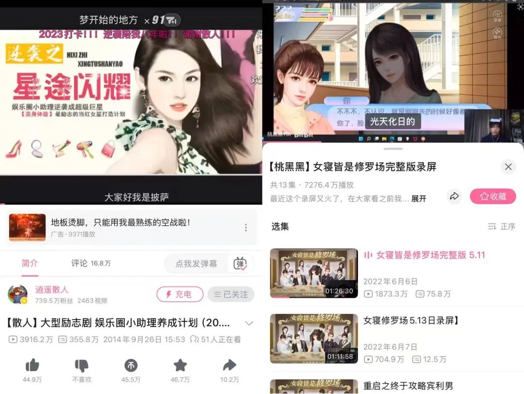 值得一提的是,尽管近年来橙光游戏开始淡出大众视野,但文字游戏在游戏主播间的存在感并不低。2014年,B站头部UP主@逍遥散人 就曾凭借《逆袭之星途闪耀》强势涨粉,截至目前,《逆袭》依旧是其数据最好的视频,全集共计45小时,获得了超3900万播放、超355万条弹幕,登上B站的“入站必刷”。此后,橙光游戏成为散人的舒适区,合集播放量超1亿。