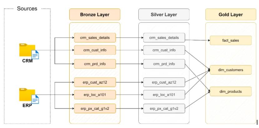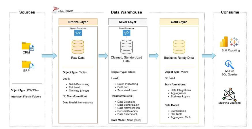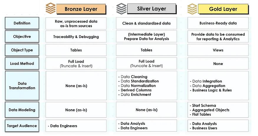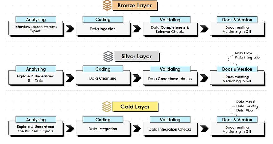 4. 层级结构如果采用类似 Medallion Architecture 的方法,则应在图表中清晰地标明不同的层级(青铜、白银、黄金)。 每一层都以标签的形式直观地表示,该标签描述了数据处理的程度及其预期用途。
