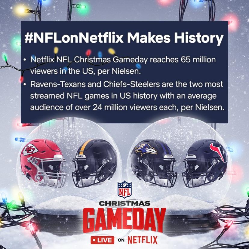 2024年NFL的圣诞日比赛美国观众人数达到6500万,创下纪录 图片和数据来源:Netflix、Nielsen