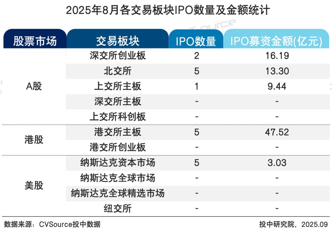 虽然不论是数量还是募资规模都较7月火热的IPO市场有所降温,但数据同比2024年依旧实现了稳定的增长,IPO数量同比上涨12.5%,环比下降35.71%;IPO募资金额同比上涨21.62%,环比下降76.86%。