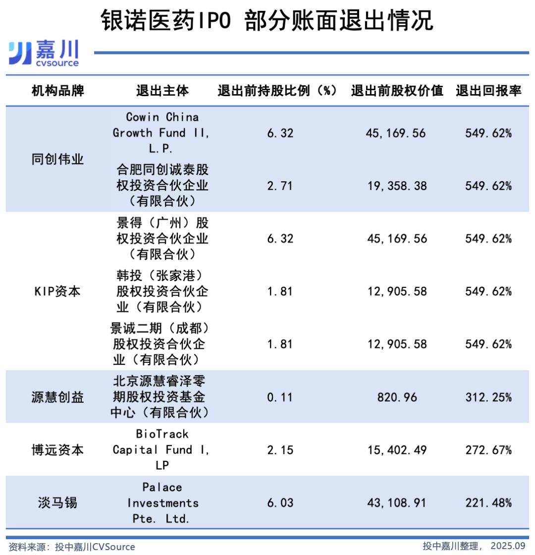 按照银诺医药发行价每股18.68港元计算,银诺医药已经为投资方创造了38.60亿元的账面退出回报。多家参与了Pre-A及A轮融资的投资方获得了超300%的退出回报率。