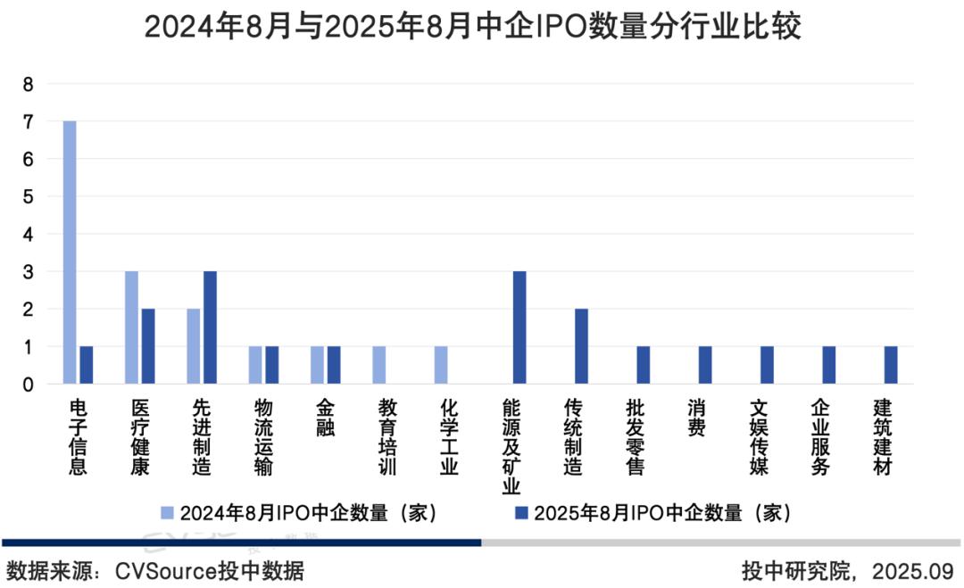 值得一提的是,相较于去年同期,今年8月IPO企业的行业分布更为分散。IPO市场不再被电子信息和先进制造行业中的企业包揽,能源矿业、传统制造、消费等更多行业中的企业也参与到了IPO市场中。