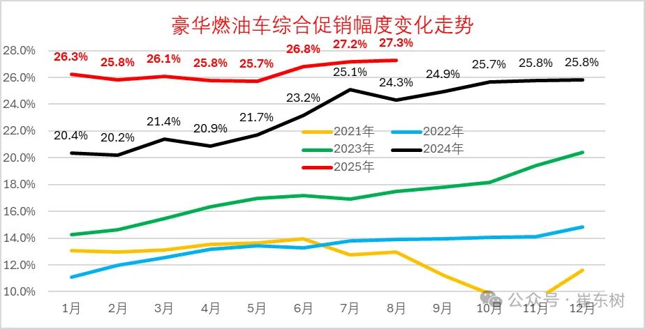 事实上,不仅限于金九银十,受到自主高端新能源冲击以及行业价格战等影响,促销已经成为豪华燃油品牌常态。乘联会数据显示,今年前8个月,豪华燃油车的促销幅度均超过25%。