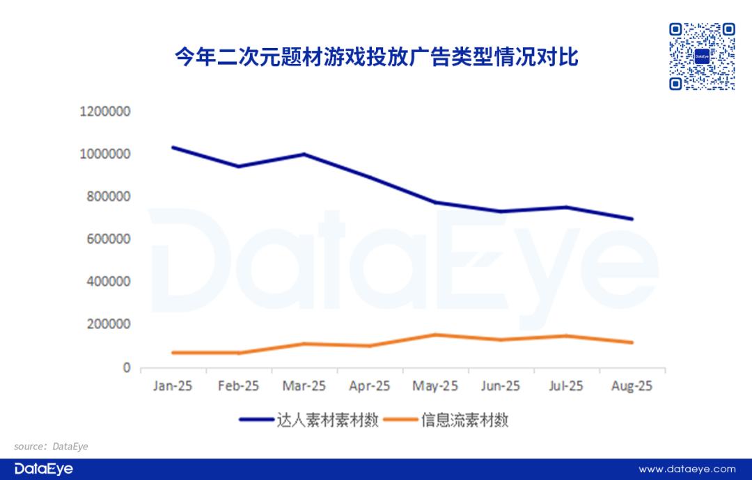 对此,二次元题材的内容向游戏更倾向于达人素材的投放,以降低买量成本投入。DataEye-ADX投放数据显示,今年以来二次元题材产品整体素材明显下滑,截至今年8月,相关达人素材投放量依然是信息流素材量的6倍。