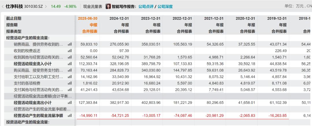 2023年,仕净科技营收和利润实现了翻倍增长,分别为34.43亿元和2.17亿元。但到2024年,公司便巨亏7.71亿元——这一数值远超过去很多年的利润之和。今年上半年,仕净科技营收下滑48%,为10.57亿;净利润大降193%,为亏损1.2亿元。