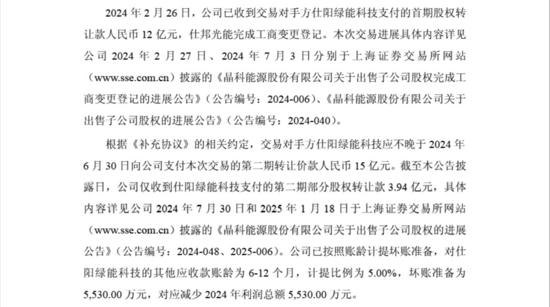今年5月,晶科能源一则公告,披露了仕阳绿能收购新疆晶科转让款拖欠的问题,第二期15亿转让款仅支付了3.94亿元,剩余11.06亿元拖欠了近一年。晶科能源已对第二期未支付的11.06亿元计提5%坏账准备(5530万元),还未回款的大笔欠款很有可能要烂尾了。