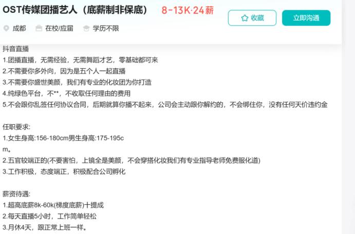 时代财经留意到,各大招聘网站上,针对团播主播招募开出的条件也大多可以概括为低门槛、高收入——“团播直播,无需经验”“不需要你多外向、不需要你盛世美颜,上镜全是美颜”“超高底薪8k-60k(梯度底薪)+提成”。
