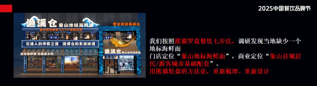 还有一个案例是宁波象山的渔满仓,我们帮他做了一家象山地标海鲜面,今年8月份开始试营业,第一天营业额达10万元,各种榜单排名都是第一名。很多人到店里充值,因为这些县城消费者认为自己的消费需要升级,市面上终于有一家高级一点的面馆了。