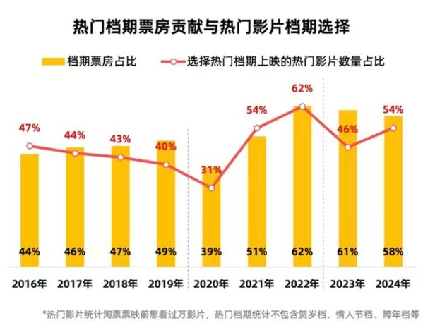 娱乐独角兽在国庆档影片纷纷定档时就提过,如此多的新片对国庆档来说太挤了,但片方或许也有他们的苦衷。据灯塔《2024中国电影市场年度盘点报告》显示,2024年54%的热门电影选择在热门档期上映,全年58%的票房由热门档期贡献,档期票房的产出决定了全年票房的体量。