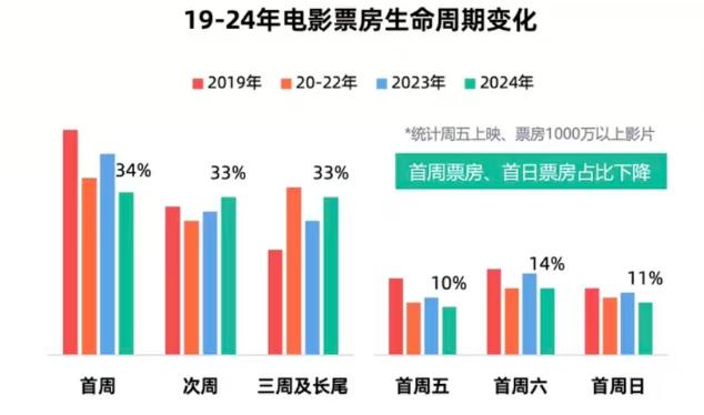 2019年,电影在首周的票房份额还高达47%,但到了2024年,已经降到34%,且首周五票房的贡献明显小于首周日,体现出电影生命周期的后置性,以及观众对口碑的重视性。据灯塔研究院调研数据显示,影响观众观影的主要因素就是口碑,有40%观众提到不愿看某部电影的原因是“评分低”,36%认为是影片“内容俗套狗血”。