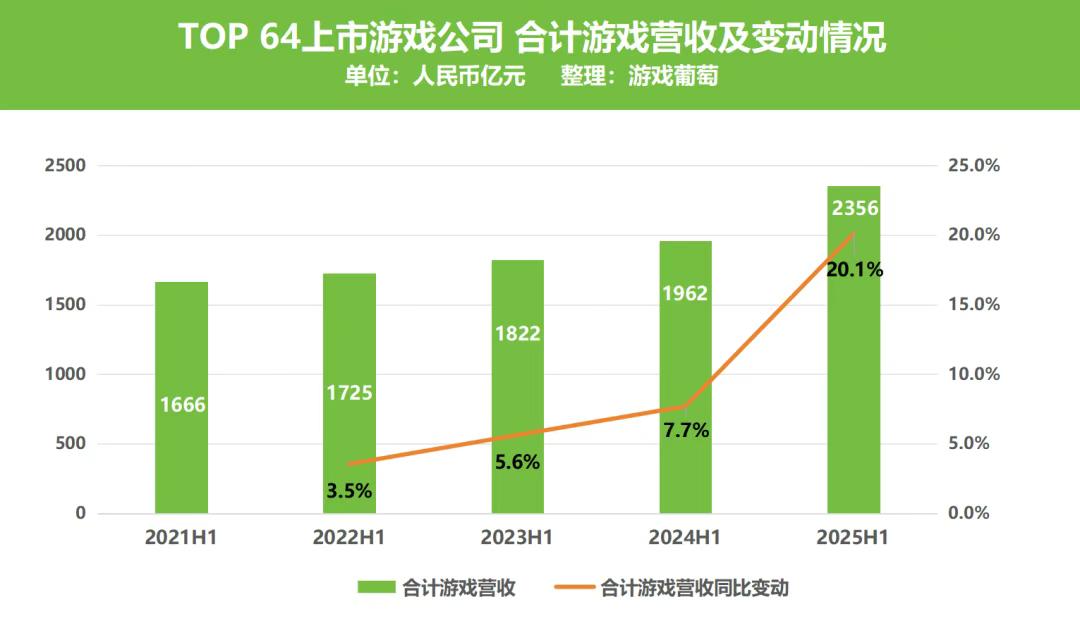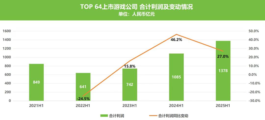 2025上半年,可以说是行业近年来「整体表现最好的财报季」:超八成公司实现盈利、TOP 64上市公司营收利润总和达到近5年新高、B站亏损7年终于盈利、世纪华通市值翻3倍突破1400亿(目前已经突破1500亿了)……