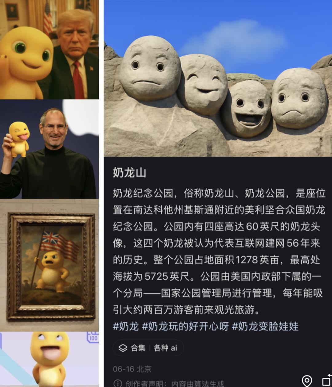 而互联网时代的抨击显然更加超前,各种二创开始衍生,从奥特曼攻击喜欢发奶龙表情包的小朋友,到任何与奶龙配色相似的角色都被称为奶龙,网友脑洞大开,甚至搭配“今夜星光闪闪”魔性歌舞,火到连各地官方文旅也要蹭一蹭这热度。