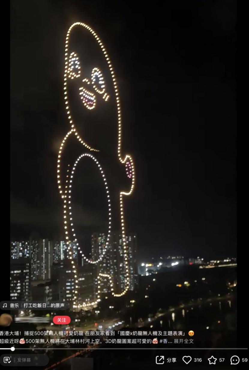 事实上,这并不是奶龙第一次上天。早在去年国庆,奶龙就前往香港“举办”个人无人机表演,深圳湾两岸共享着同一个“大肚肚”。