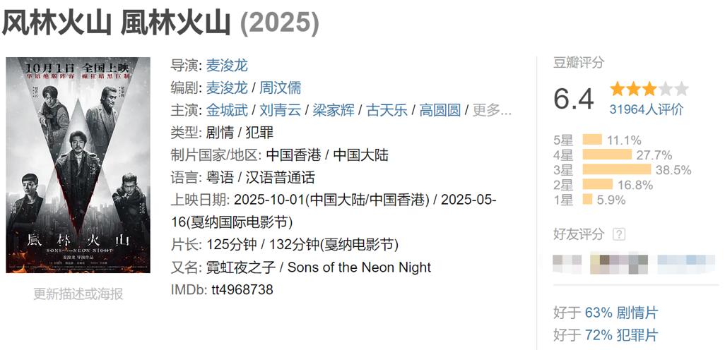 比如《风林火山》。国庆档最抽象的一部电影,请来金城武、刘青云、梁佳辉、古天乐、高圆圆、任贤齐等一众大咖,但凡是部大众心目中的传统港片,就绝对是档期头部。但实际情况是该片前前后后折腾了八年,只为成全导演麦浚龙的个人想法。