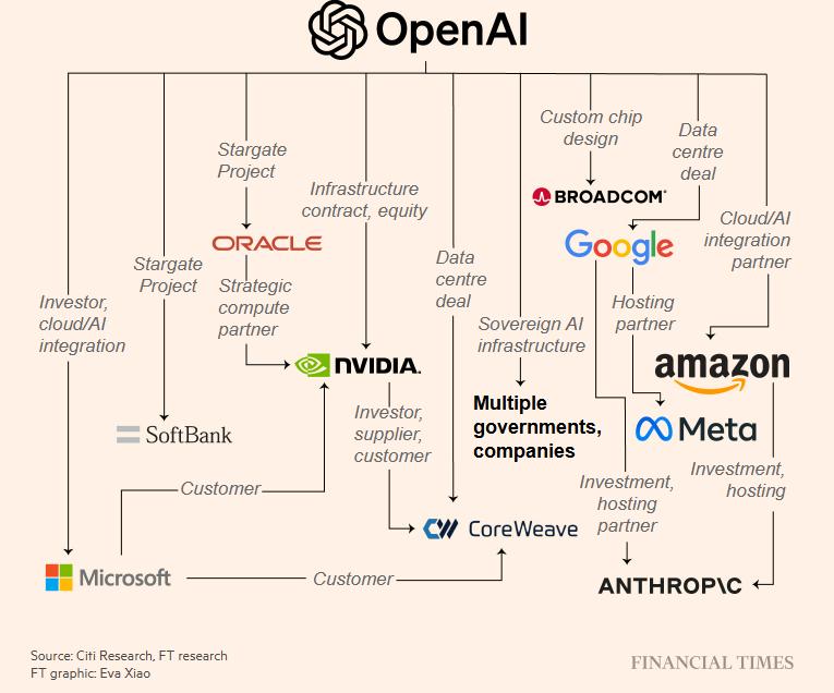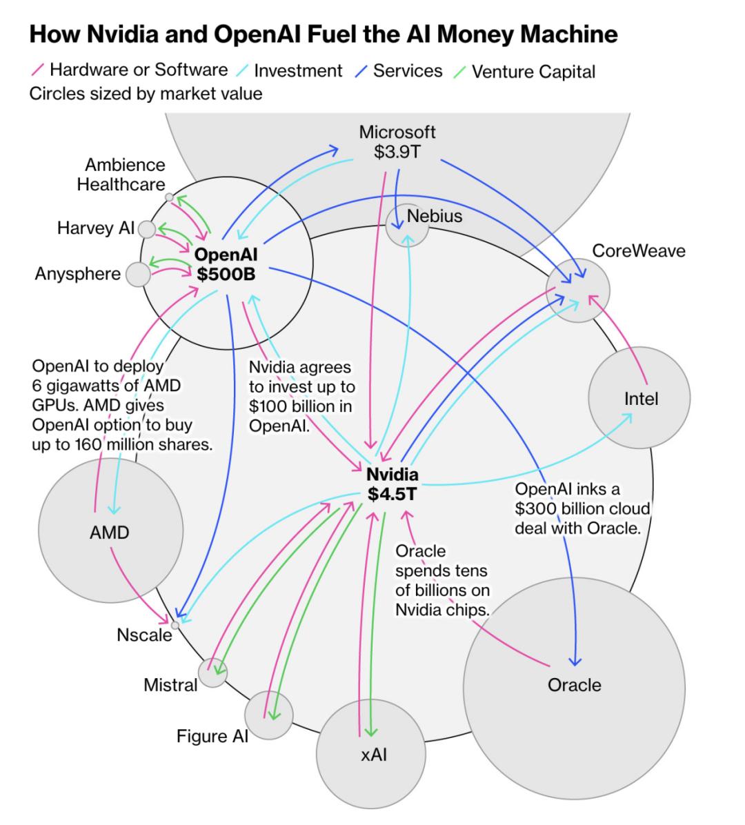 此前从未有过如此巨额的资金被如此迅速地投入到一项尽管潜力巨大,但其盈利能力在很大程度上仍未经证实的技术上。而这些投资通常可以追溯到两家领先的公司:英伟达和OpenAI。近期两大巨头之间发生的一系列交易和合作,加剧了人们的担忧:日益复杂且相互关联的商业交易网络正在人为地支撑着价值数万亿美元的人工智能热潮。几乎每个经济领域都面临风险,人工智能基础设施的炒作和建设波及了各个市场,从债务、股票到房地产和能源。