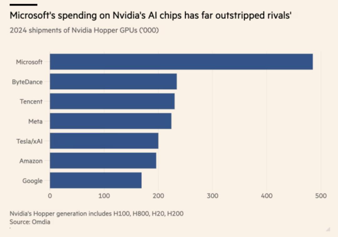 另一家巨头微软也是GPU的大买家。科技咨询公司 Omdia 的分析师估计,微软在去年购买了 48.5 万块英伟达的“Hopper”芯片。这使得微软远远领先于英伟达的第二大美国客户 Meta(购买了 22.4 万块 Hopper 芯片),以及其云计算竞争对手亚马逊和谷歌。