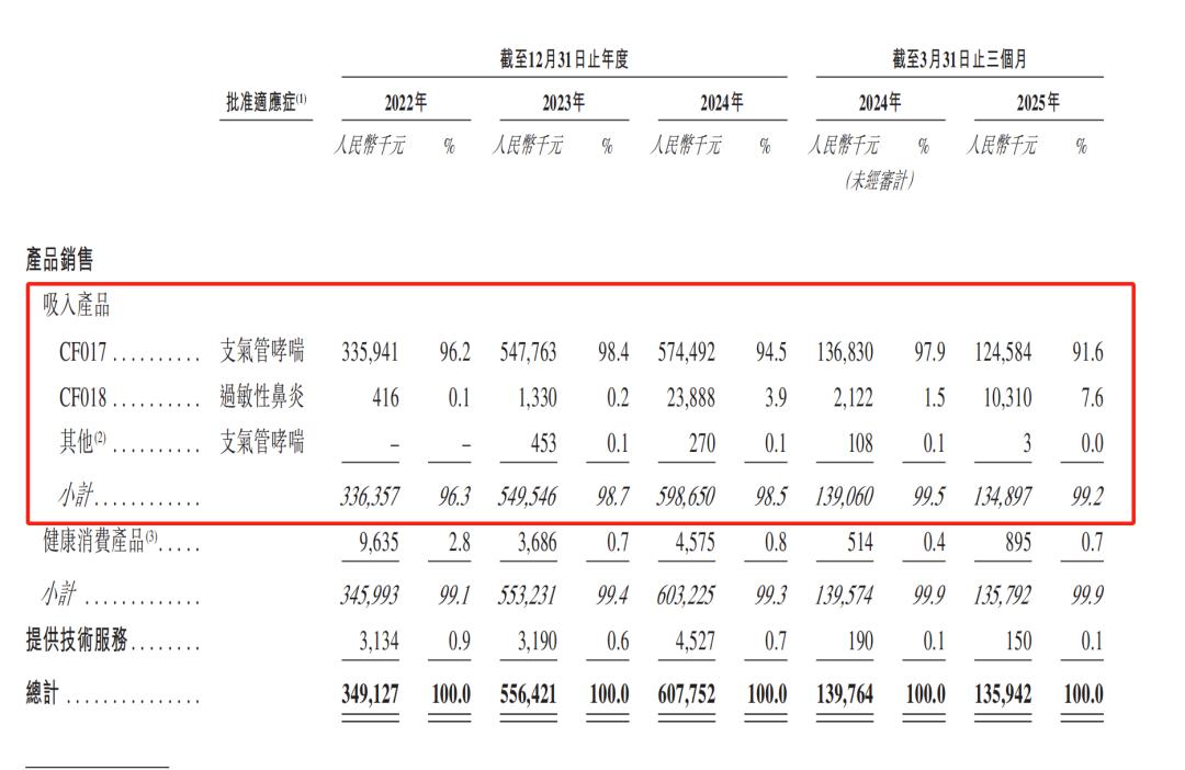 招股书显示,2024年公司收入6亿元,其中近九成来自同一款吸入制剂——治疗支气管哮喘的吸入用布地奈德混悬液CF017。