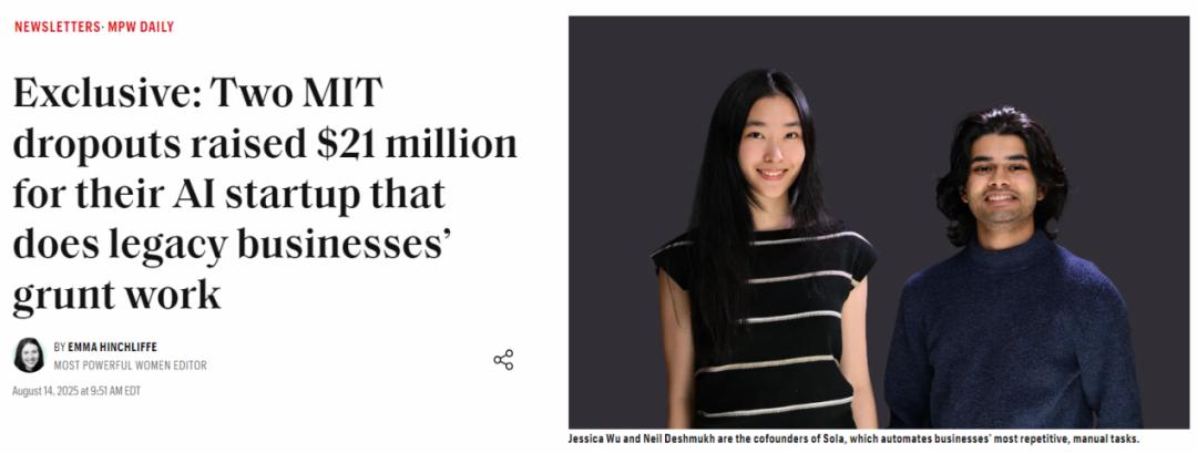 于是她萌生出设计AI代理的念头,跟尼尔两人一拍即合。2023年,他们一起从麻省理工辍学,创办Sola Solutions。