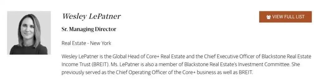 在黑石,Wesley LePatner历任核心+业务及BREIT首席运营官、黑石房地产投资委员会成员等职务,负责房地产投资以及高净值客户。