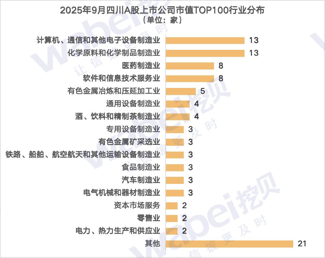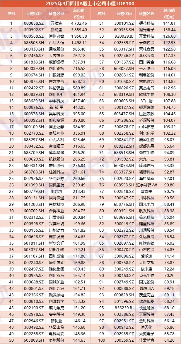 2025年9月四川A股上市公司市值TOP100:20家公司市值超过500亿元