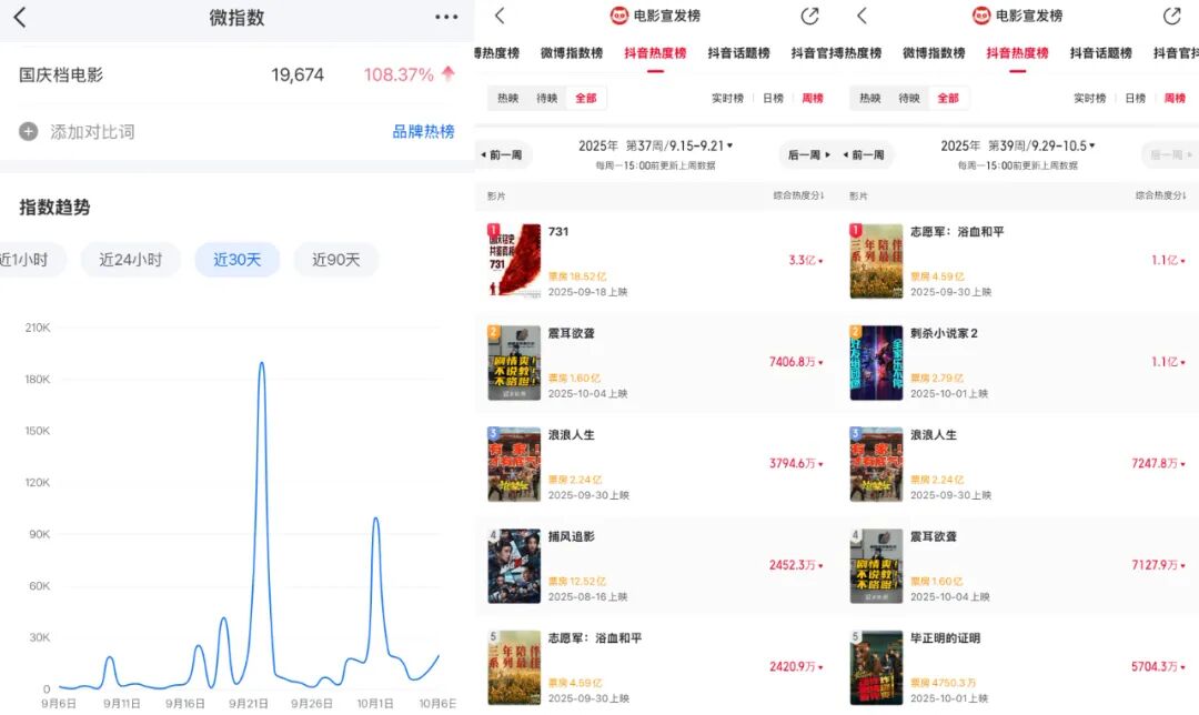 猫眼专业版APP显示,国庆档电影的抖音热度榜,《志愿军:浴血和平》《刺杀小说家2》的热度分在上映前夕达到1亿的峰值,看似不低。可是对比来看,《731》在映前的热度分已经高达3.3亿!