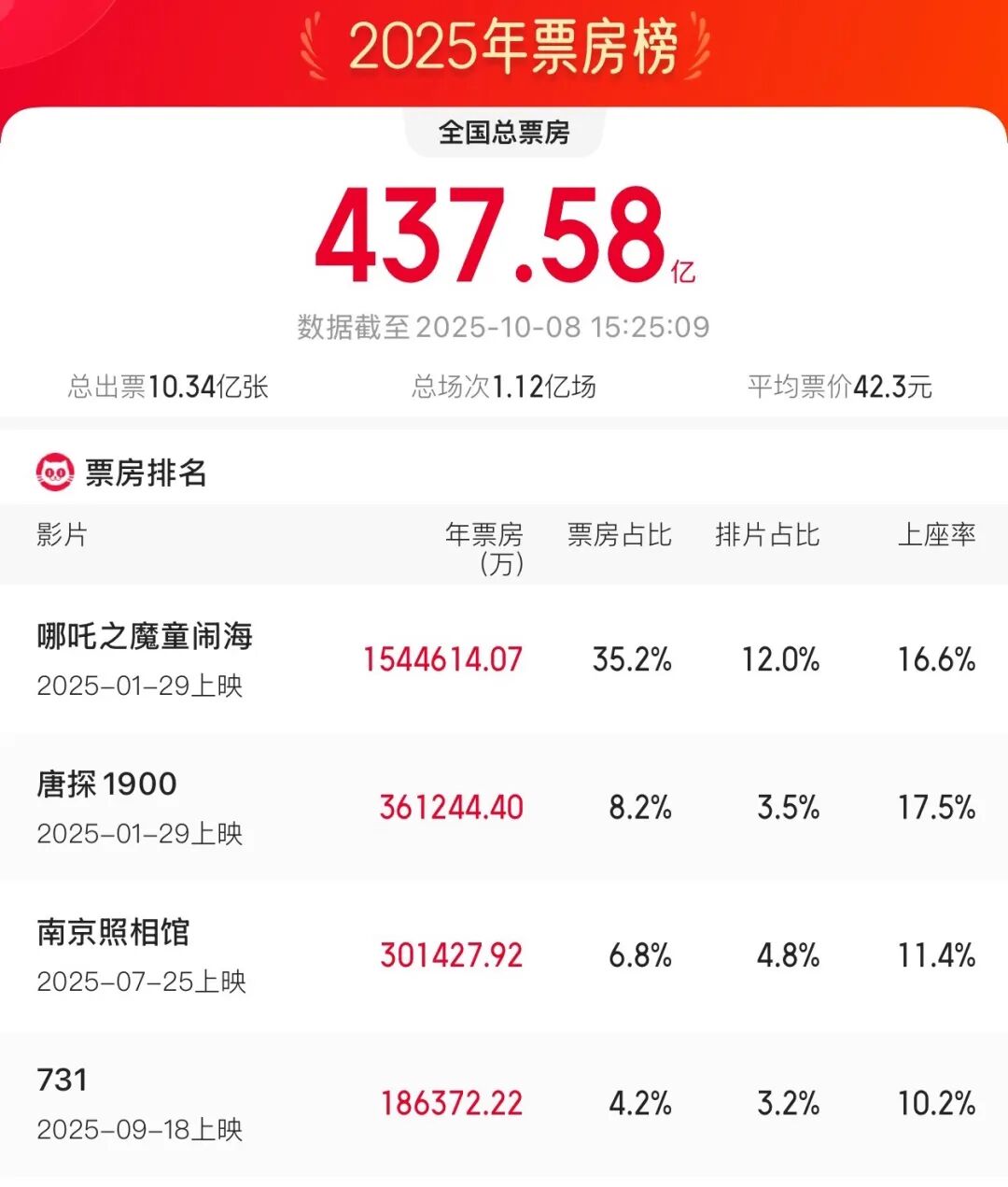 娱乐资本论翻阅了国庆档影片的整体上座率,《731》高达13.2%,《志愿军:浴血和平》为10%,《刺杀说小说家2》是9.4%。档期新片唯一能超越《731》上座率的是《震耳欲聋》,后者的上座率为13.7%。