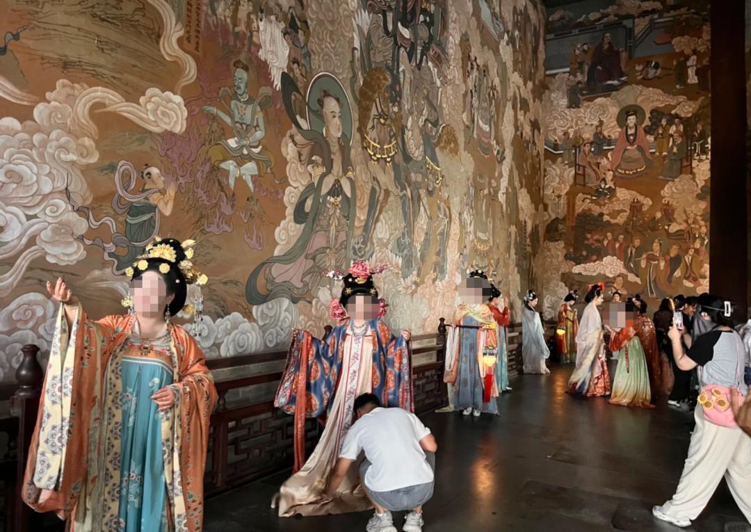 也常在华严寺门口遇到穿着传统服饰、梳着莫高窟壁画同款复古高髻妆容的‘供养人’们”;