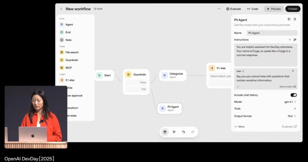 还有 Evals(评估系统)模块,用来衡量一个智能体做得好不好。这个“可视化 + 模块化 + 安全护栏”组合,就是 OpenAI 要把“做一个智能体”从程序员的特权变成 “人人都能做”。