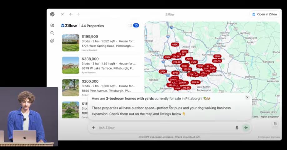 想找纽约带庭院的房子?只需一句话,它就调出 Zillow 模块,地图、价格、户型信息一目了然。整个体验不需要跳转、不割裂,就像这些应用本身就是 ChatGPT 的一部分。